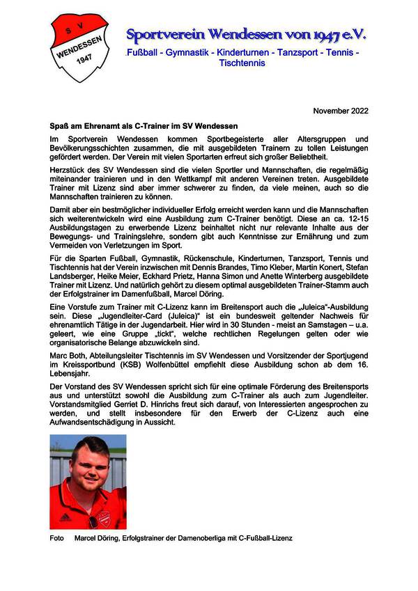 Tenor des neuen Vorsitzenden ist, dass die Nachwuchsarbeit für die Vereine als notwendig angesehen werden sollte und der Dialog mit den einzelnen Vereinen geführt werden muss, um die Bedarfe wie auch Probleme zu identifizieren und im Rahmen der Machbarkeit zu unterstützen. Marc Both engagiert sich bisher schon als Abteilungsleiter Tischtennis im SV Wendessen. Einer seiner Stellvertreter ist Gerriet Hinrichs, der 2. Vorsitzende des SV Wendessen. Komplettiert wird der neue Vorstand durch Sophie Böhm sowie Marie Pickavé und weitere freiwillige ehrenamtliche Beisitzer.