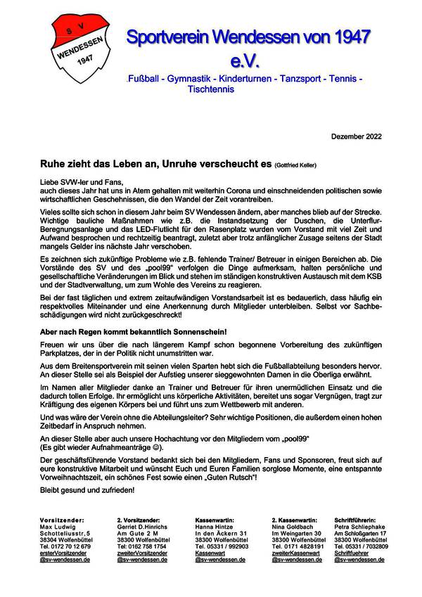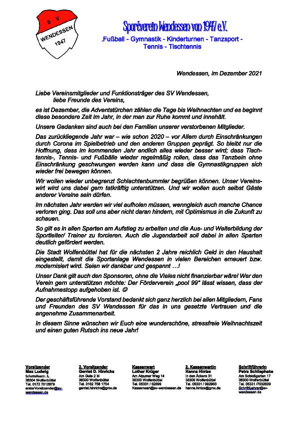 „Wenig sportliche Aktivitäten, aber trotz Corona ein relativ stabilen Mitgliederbestand“ so der 1. Vorsitzende Max Ludwig. Der Stadtbaurat von Wolfenbüttel berichtete über die vom Vorstand angestoßenen geplanten baulichen Maßnahmen beim SV. Der bisher kommissarisch tätige Gerriet D. Hinrichs wurde zum 2. Vorsitzenden gewählt. Viele Mitglieder wurden für ihre langjährige Mitgliedschaft geehrt. Zu Ehrenmitgliedern wurden Rüdiger Meyer und Siegfried Schweitzer ernannt.