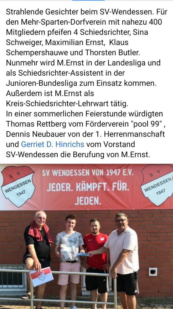 U.a. berichtete der Spartenleiter Fußball, Thomas Rettberg, von der zurzeit entspannten Situation mit 4 für den Verein pfeifenden Schiedsrichtern, darunter Sina Schwieger. Mit Maximilian Ernst hat der Verein nicht nur einen Unparteiischen gestellt, sondern zugleich einen Kreis-Schiedsrichter-Lehrwart, Assistent in der Junioren-Bundesliga und -Landesliga in seiner Mitte. Dennoch dürfen wir uns darauf nicht ausruhen, sondern müssen die Schiedsrichter-Ausbildung weiter vorantreiben, so Rettberg.